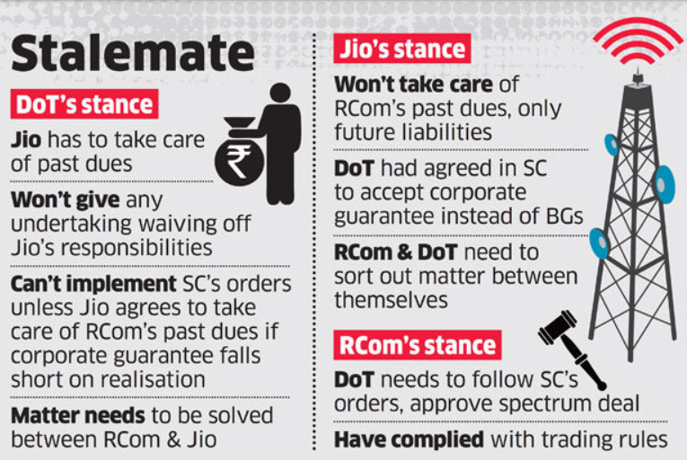 In September 2017 Ericsson terminated the contract with RCom due to a breach in agreement and filed petition in NCLT asking for liquidation of the telecom operator RCom claiming a total worth of 1500 Cr owed to the company. At this same time RJio was entering into an agreement with RCom for acquisition of right to use certain spectrum in the 800 MHz band. RCom hoped such a deal would help them cover the charges to secured creditors but has resulted in stalemate due to lot of factors.