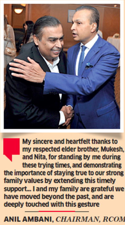 - Mukesh Ambani bails out his younger brother by providing a Rs 462 crore lifeline. Anil Ambani pays the final instalment just a day before the Supreme Court deadline and avoids a potential jail term.